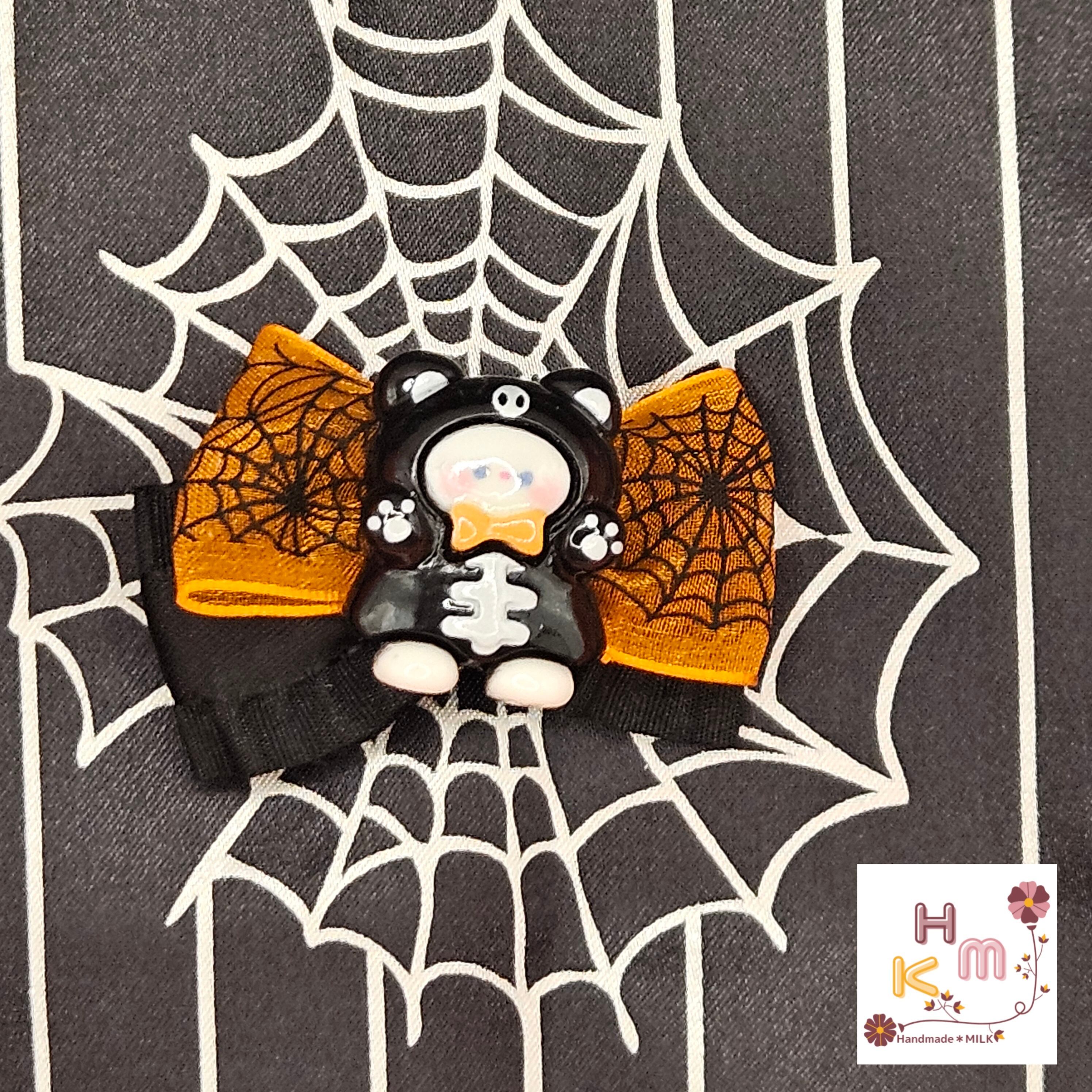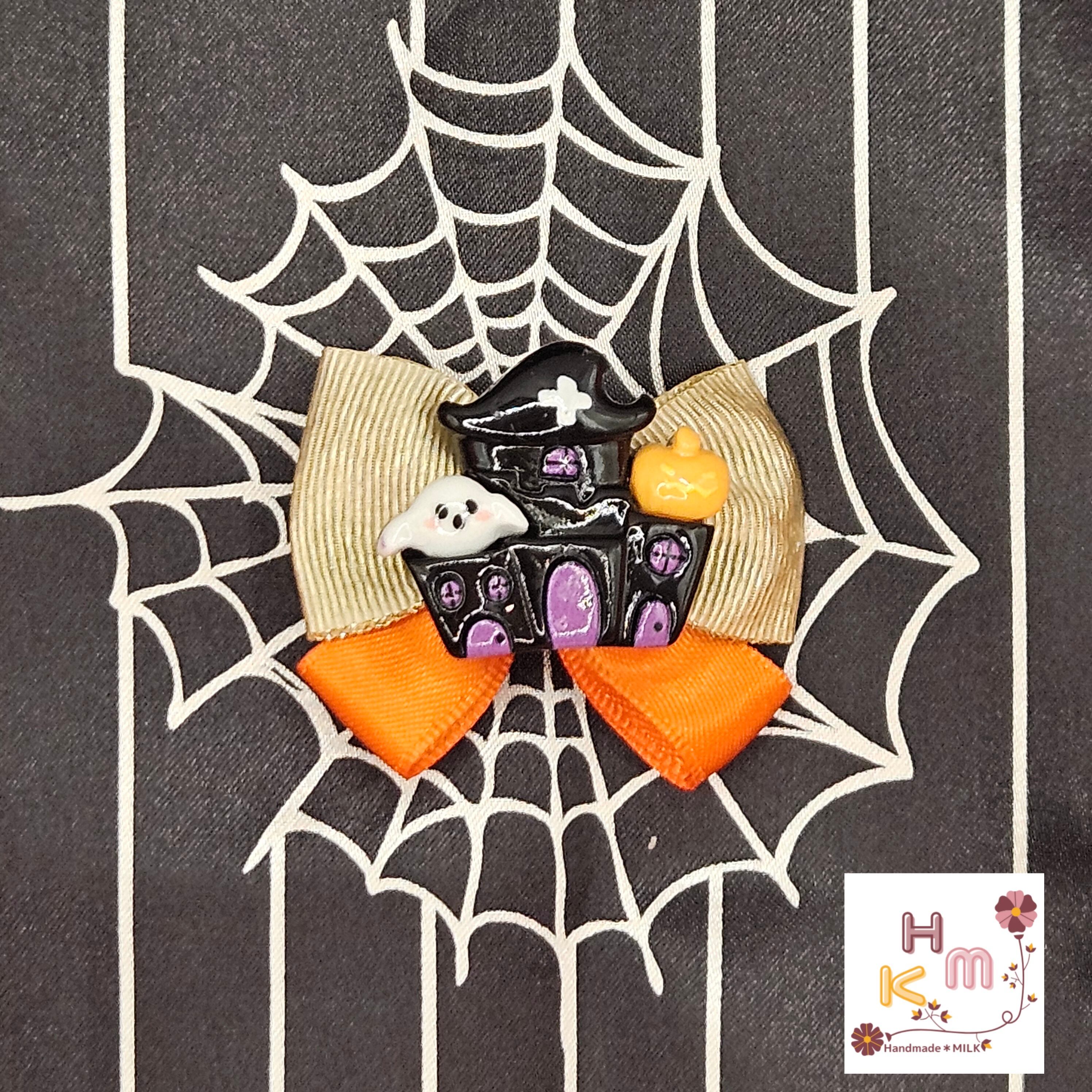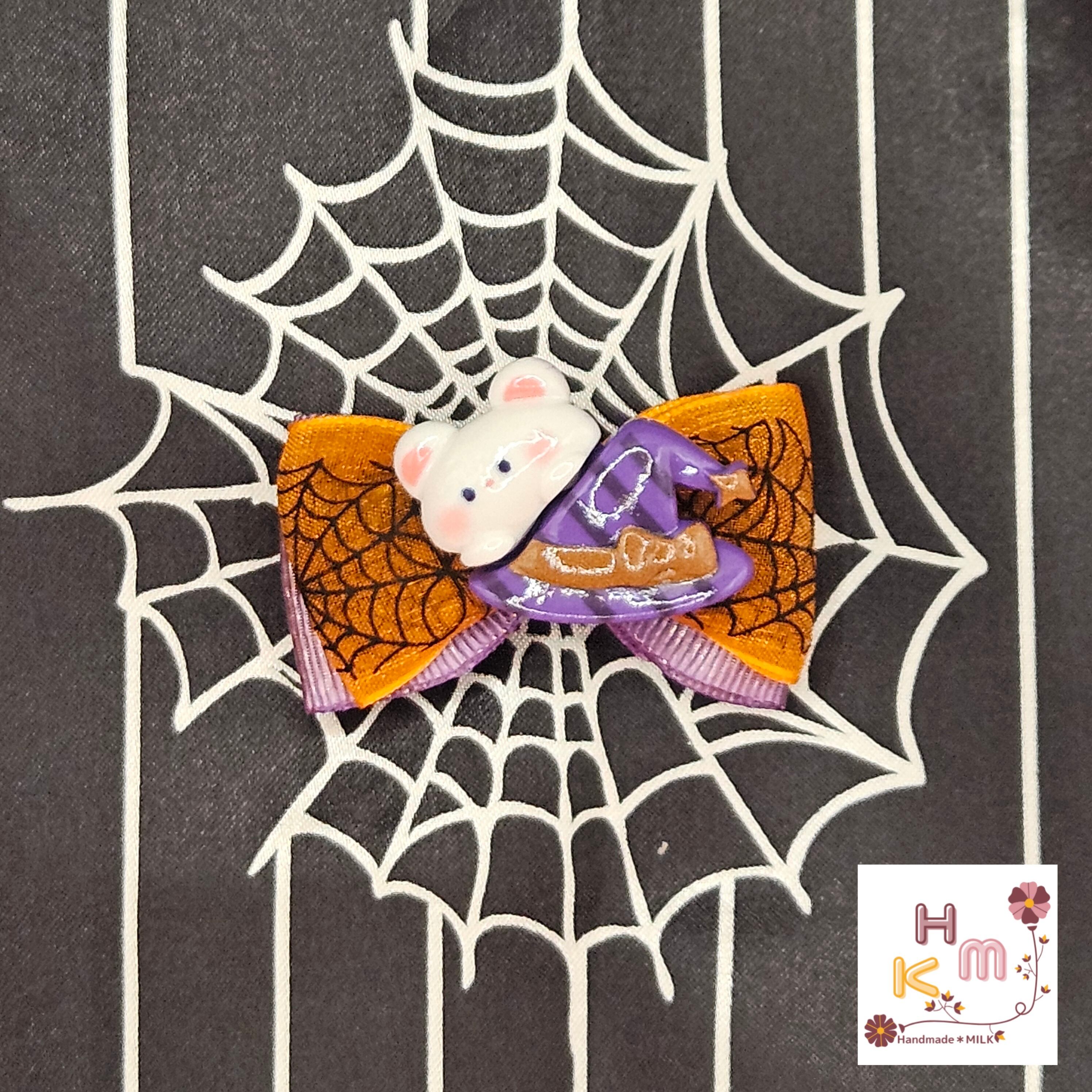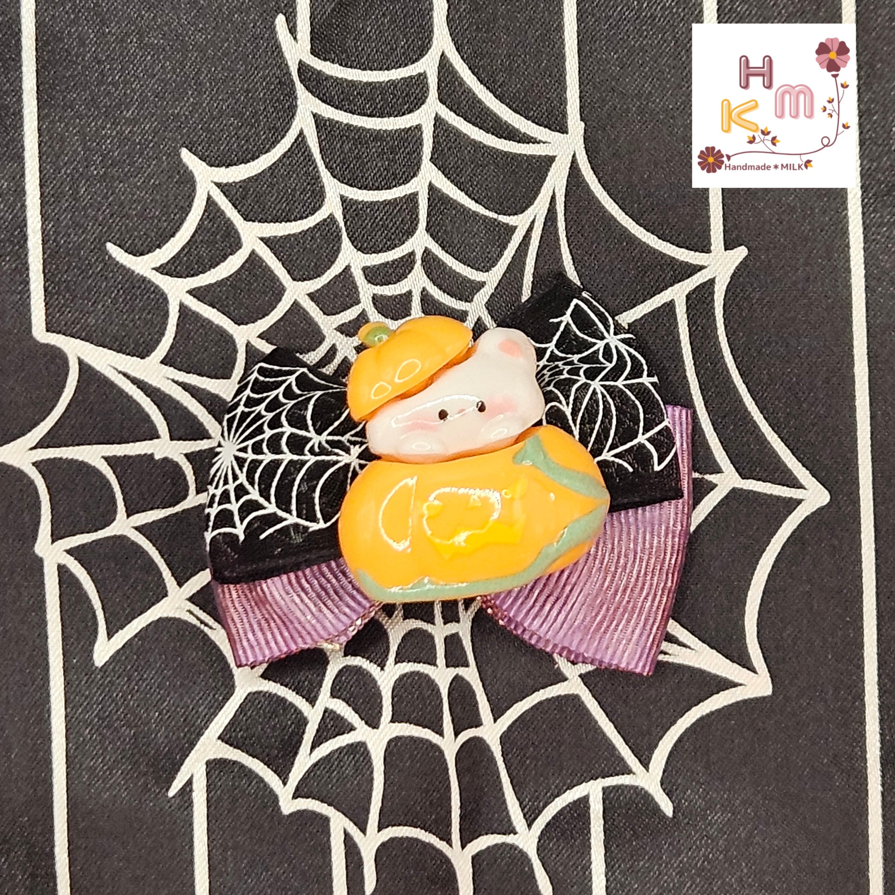 ハロウィン柄リボン☆ヘアクリップ 蜘蛛の巣 ねこ くま うさぎ マスコット 魔女 こうもり かぼちゃ オレンジ×黒×紫×金 ヘアアクセサリー 髪留め ハンドメイド