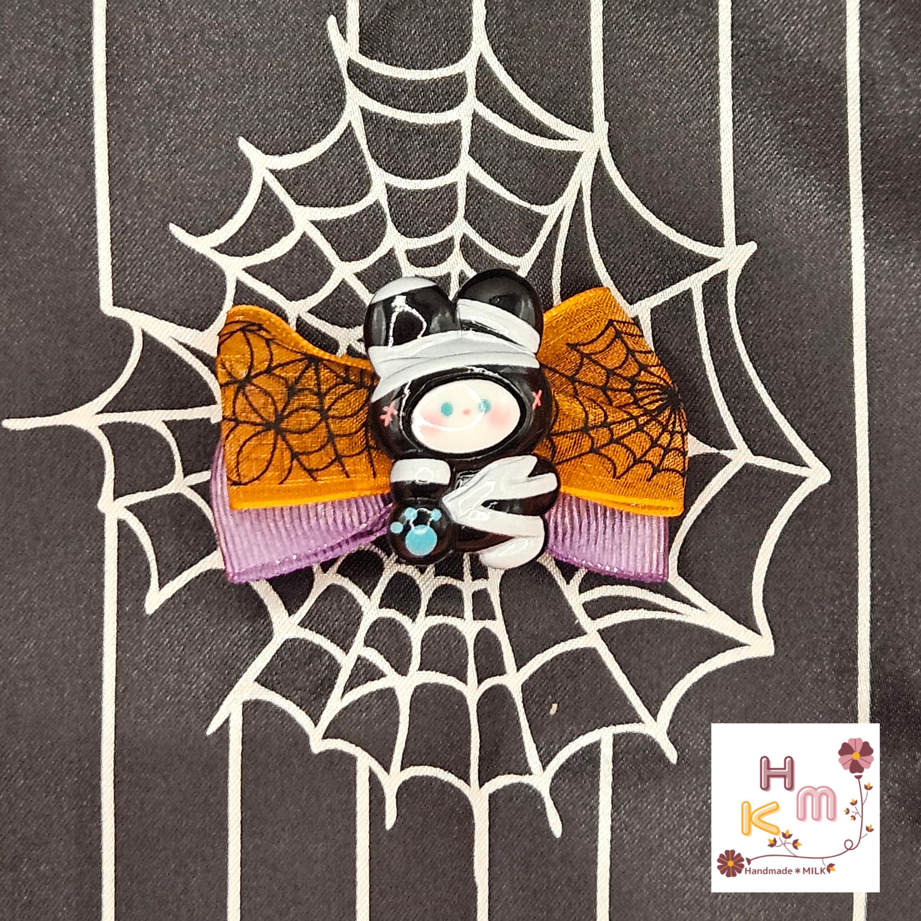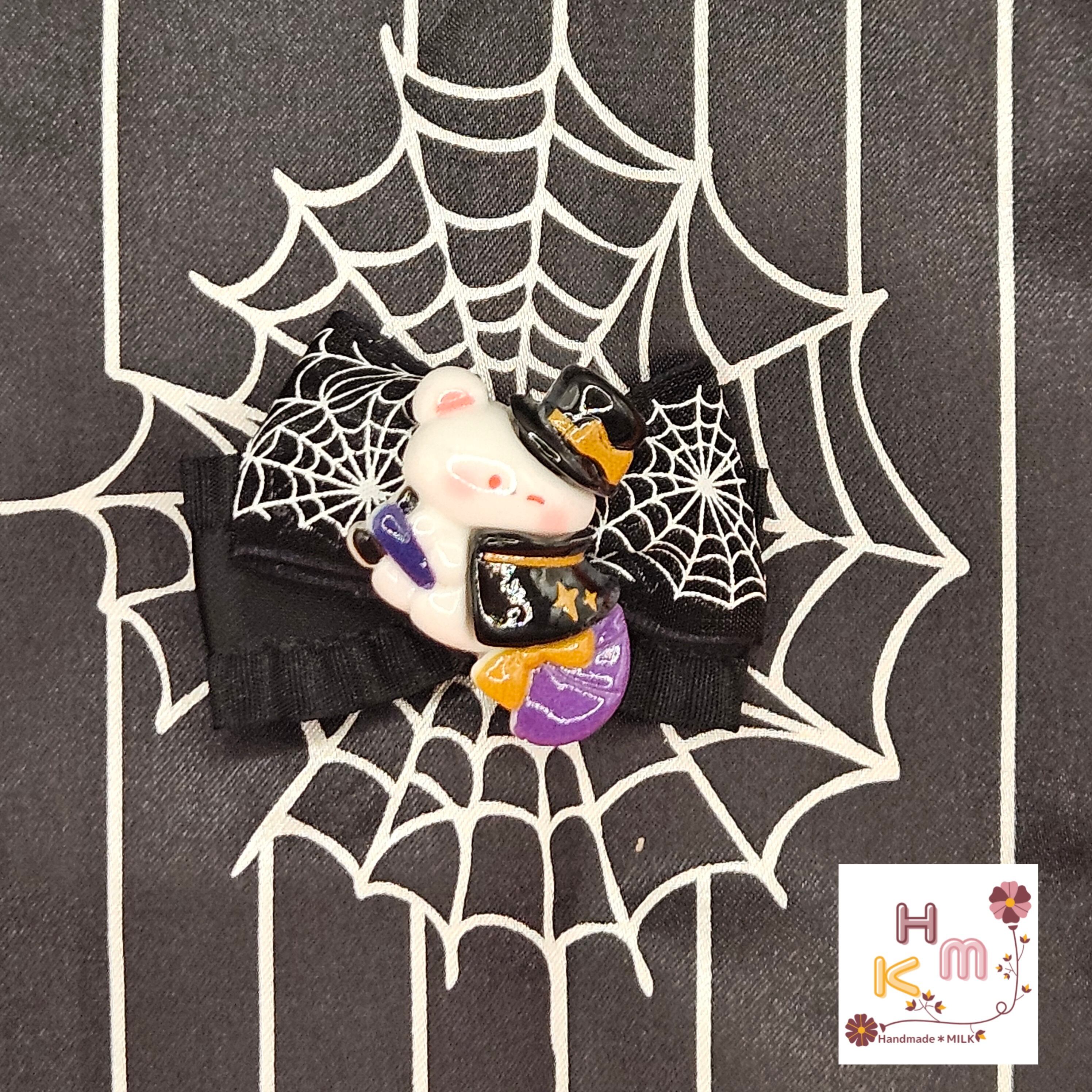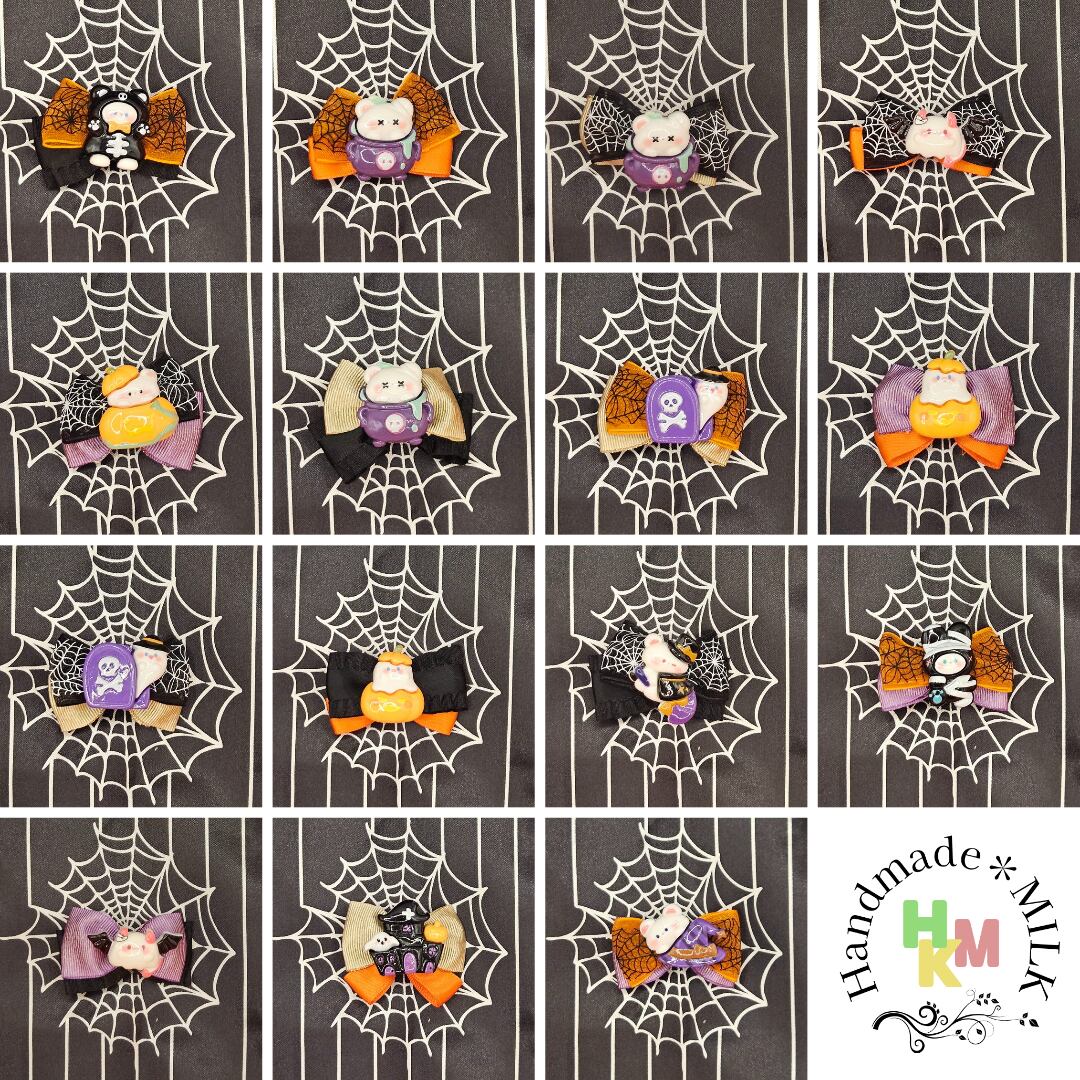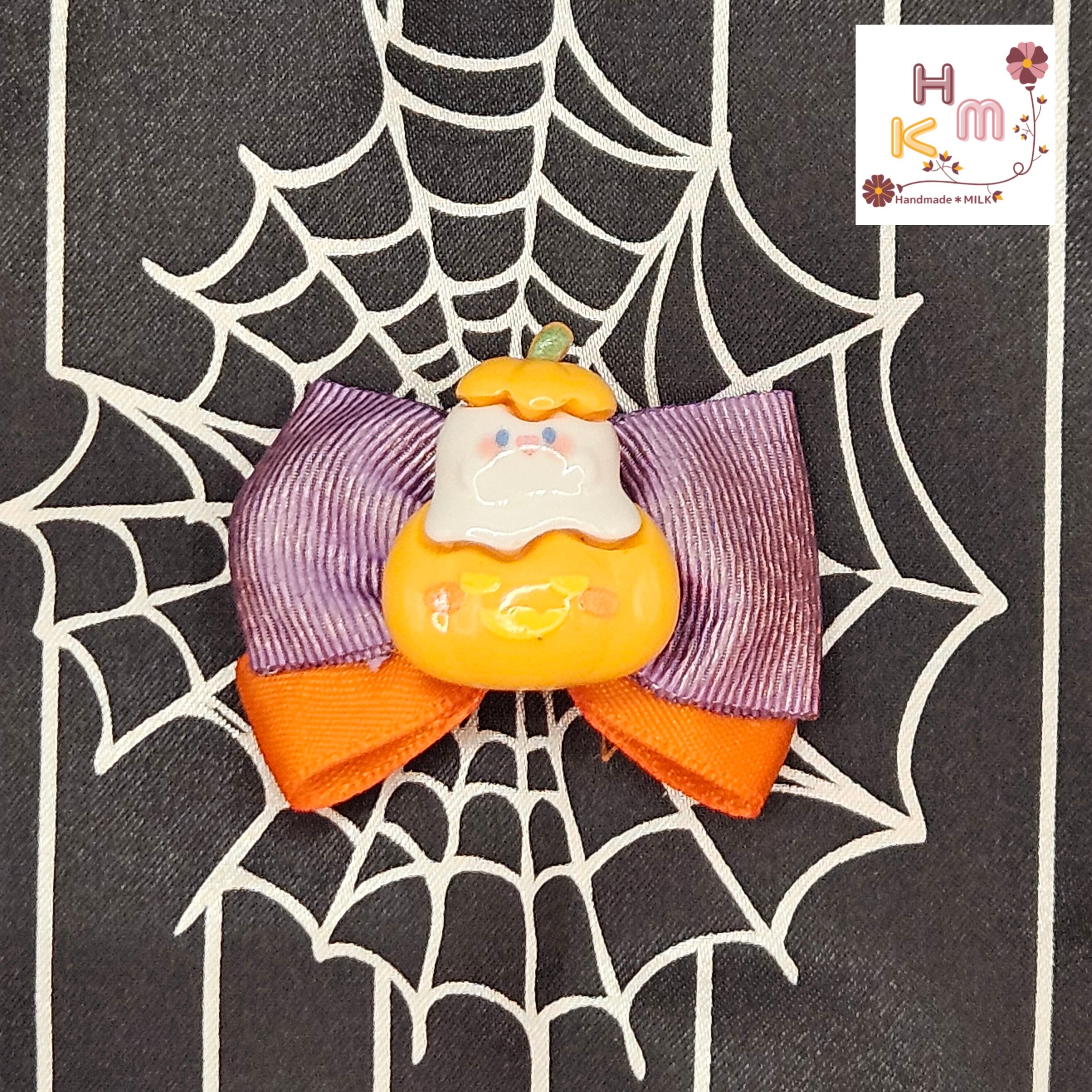 ハロウィン柄リボン☆ヘアクリップ 蜘蛛の巣 ねこ くま うさぎ マスコット 魔女 こうもり かぼちゃ オレンジ×黒×紫×金 ヘアアクセサリー 髪留め ハンドメイド