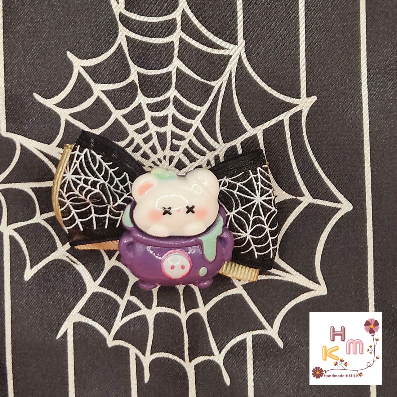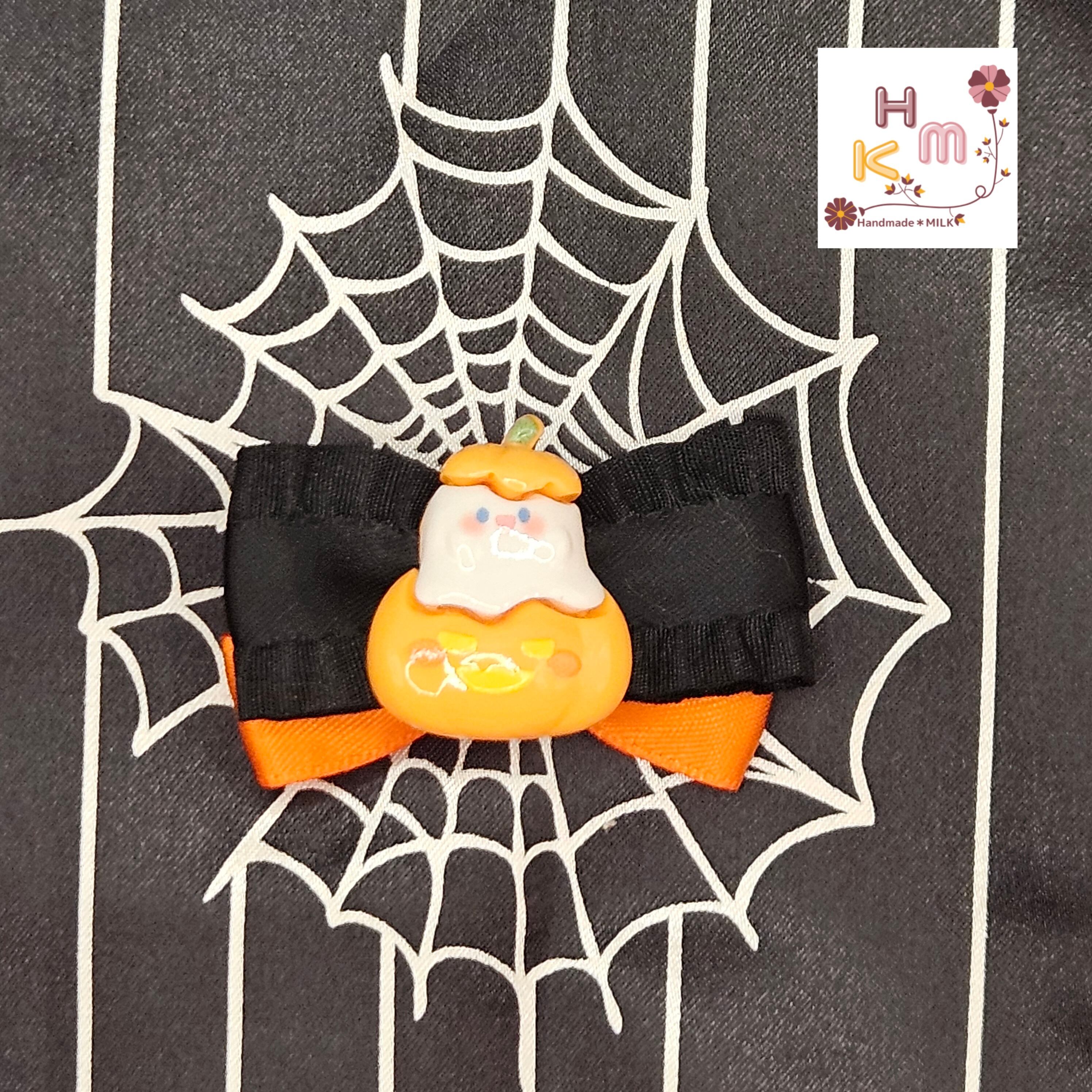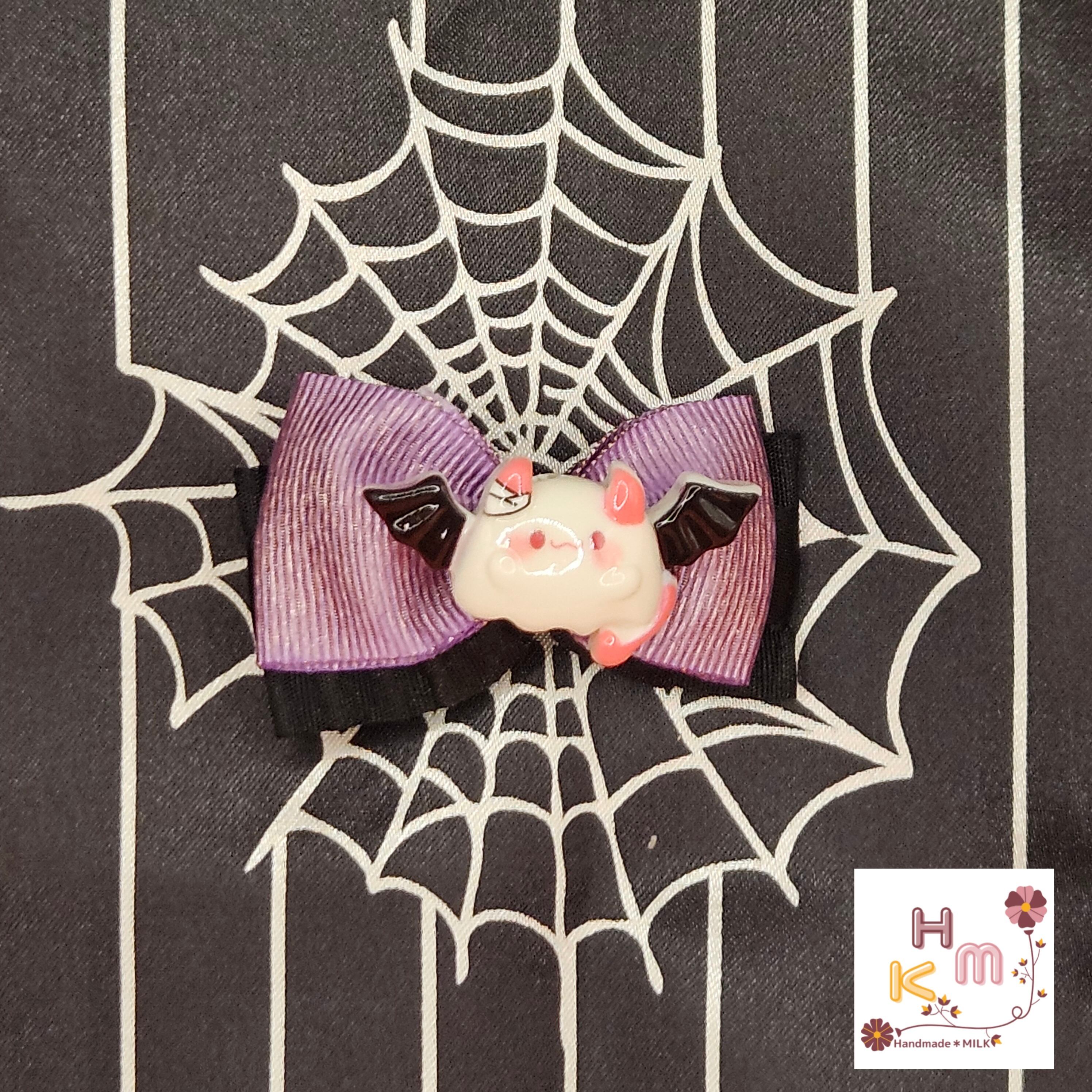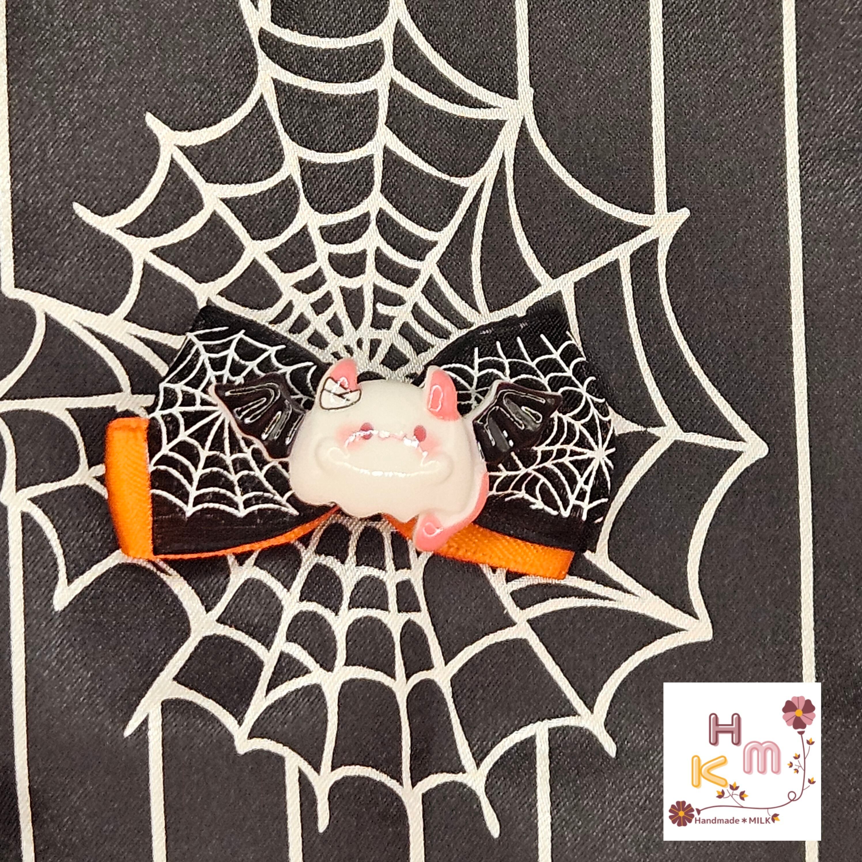 ハロウィン柄リボン☆ヘアクリップ 蜘蛛の巣 ねこ くま うさぎ マスコット 魔女 こうもり かぼちゃ オレンジ×黒×紫×金 ヘアアクセサリー 髪留め ハンドメイド