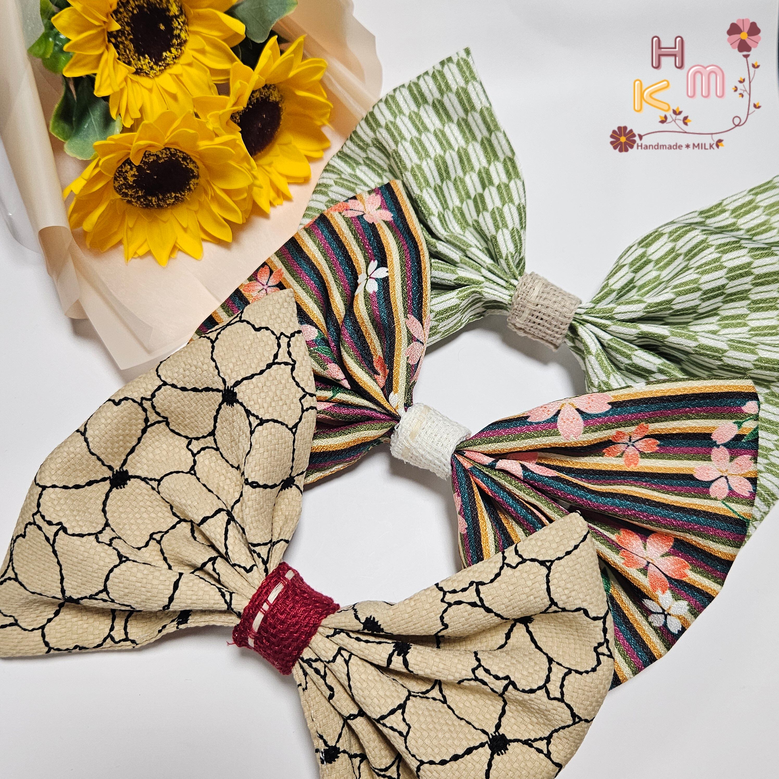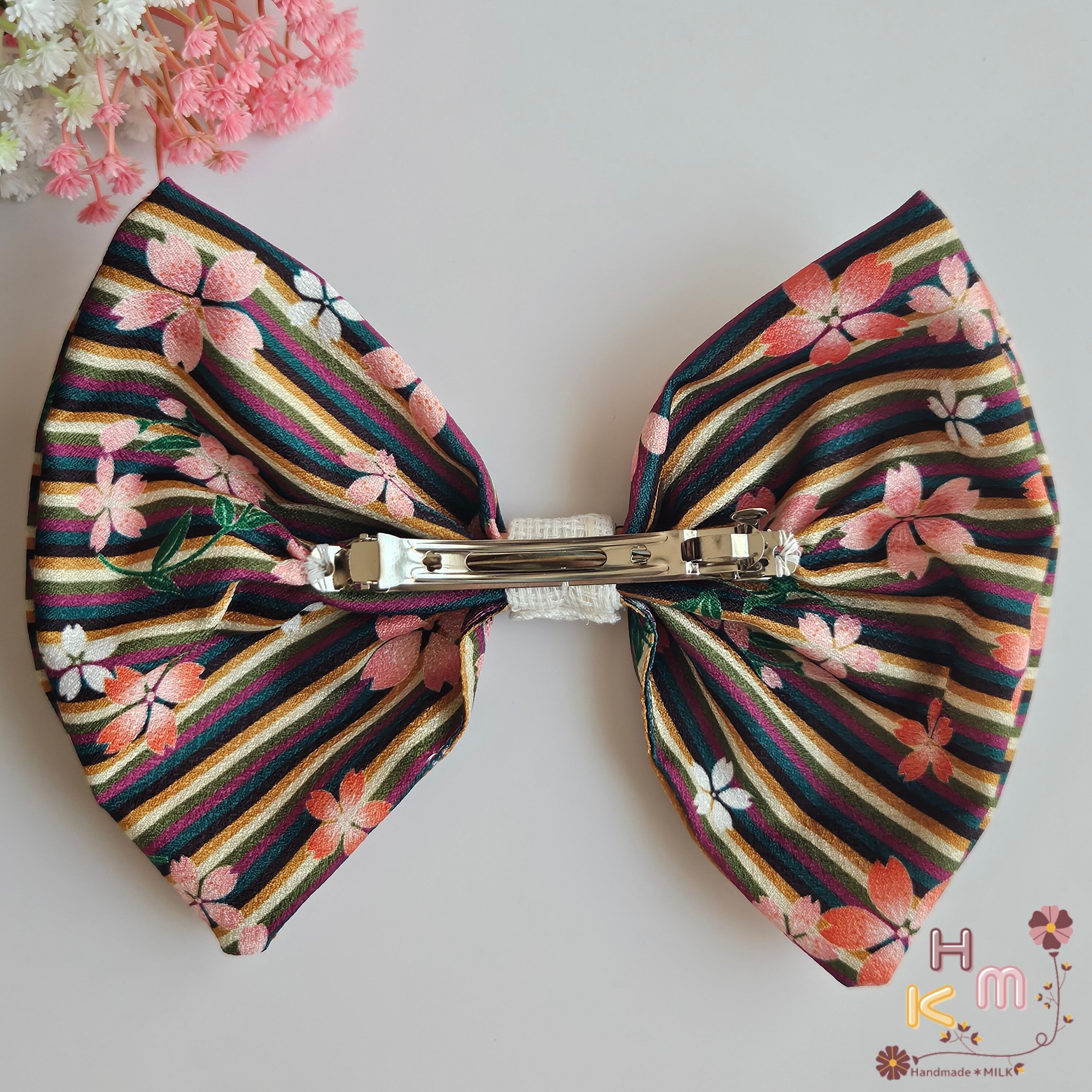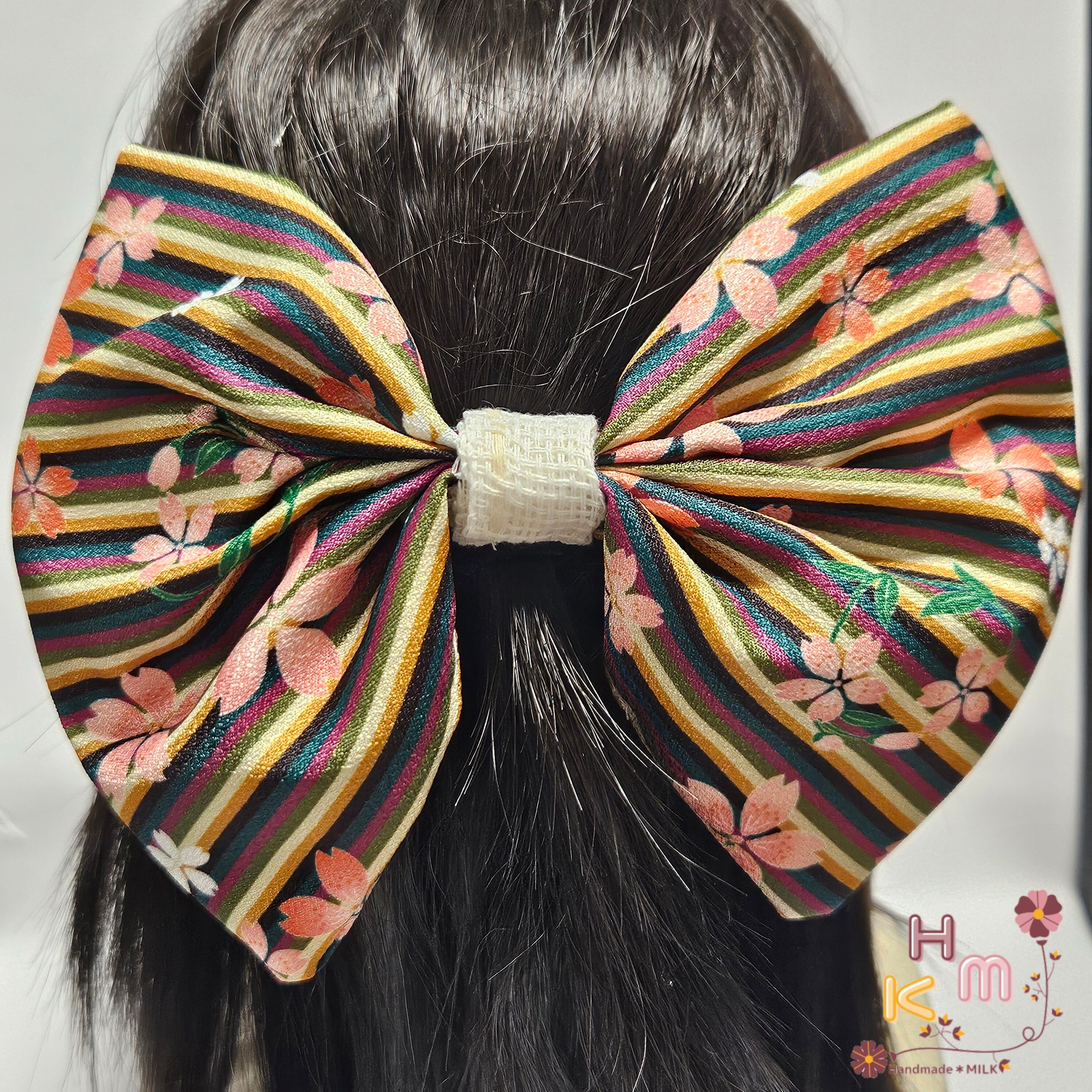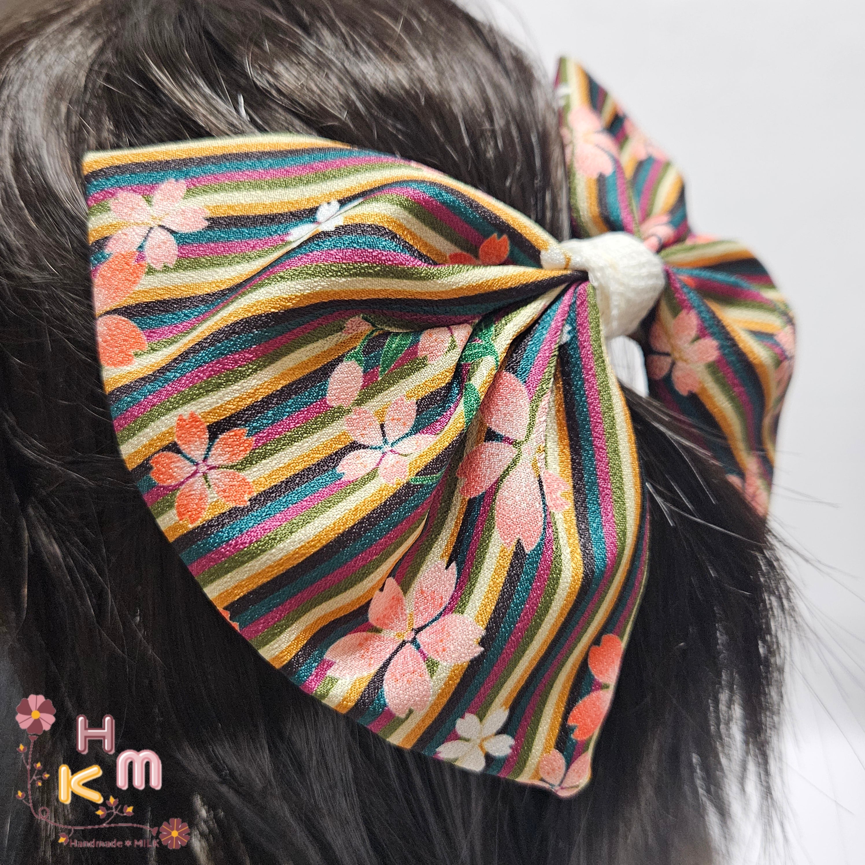 インパクト抜群*和柄で豪華なデカリボン ベージュ×花柄 ボーダー×桜 緑×白×矢絣 ポリちりめん ヘアアクセサリー 髪留め ハンドメイド