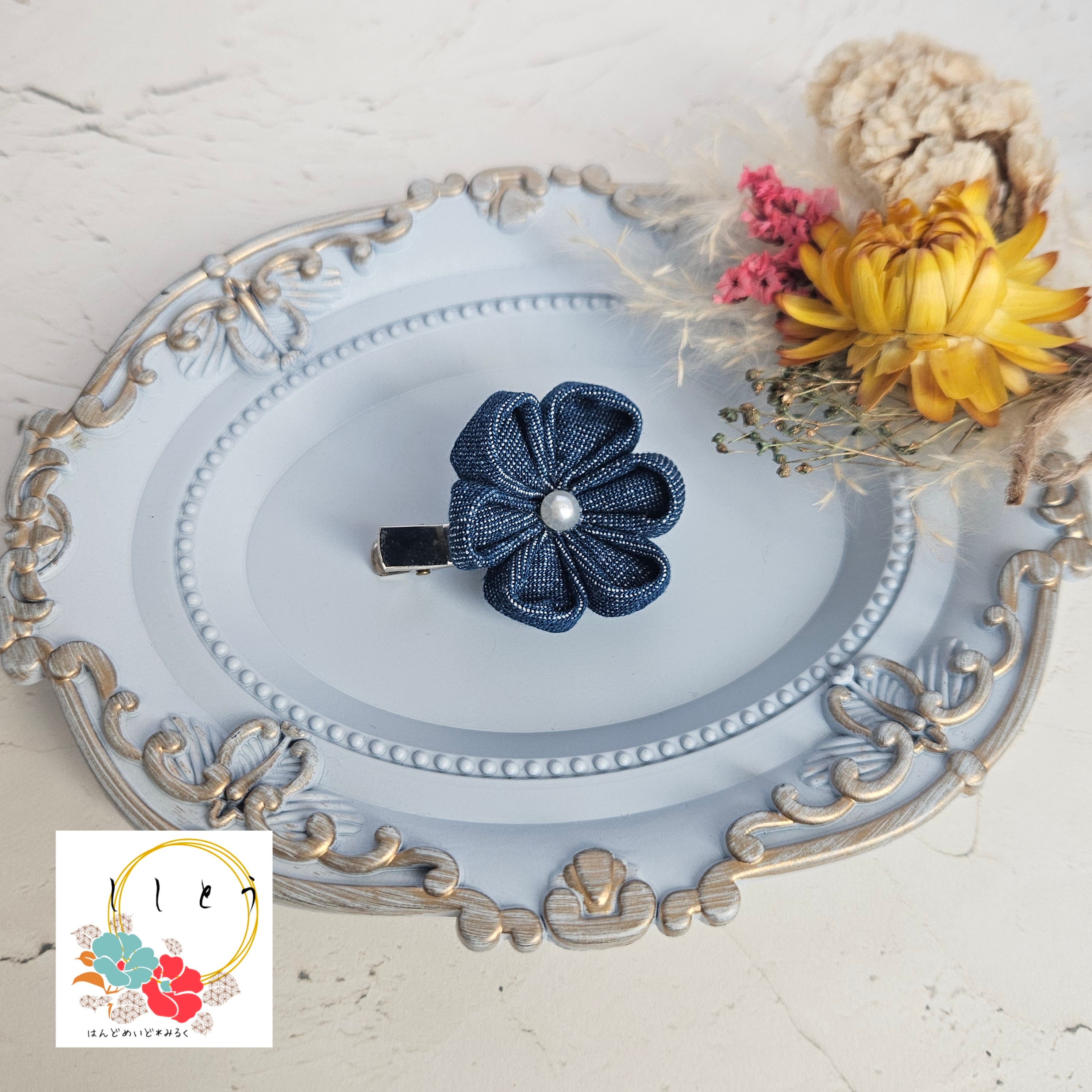 人気のつまみ細工をデニム風生地で作りました*